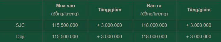 Công ty Bảo Tín Minh Châu tăng 2 triệu đồng/lượng, giao dịch tại 117,5 – 120,5 triệu đồng/lượng, trong khi Tập đoàn Phú Quý báo giá 115,5 – 118,5 triệu đồng/lượng. PNJ điều chỉnh tăng 2,5 triệu đồng chiều mua và 2,6 triệu đồng chiều bán, lên mức 115 – 118 triệu đồng/lượng.